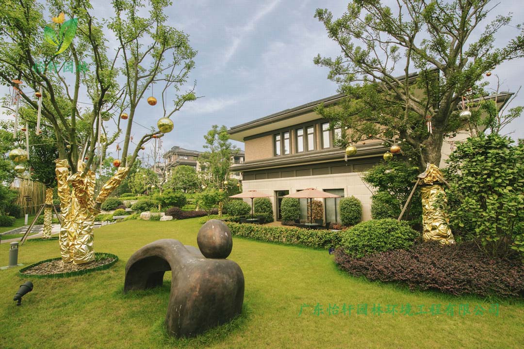 广东怡轩园林绿化公司在绿化工程的设计中延续建筑设计的恢弘大气、低调奢华的装饰主义基础,将新古典风情与自然园林融合其中,用现代自然的设计手法营造出山水间尊贵的田园别墅生活。初入展示区,两排阵列式的灯柱和高大乔木群与深浅两色相间的铺装遥相辉映,共同烘托出展示区广场强烈的尊贵感受。在广场中央,一座雕工精致的铜质雕塑,四周石材堆砌并伴着层级跌水,这让整个别展示区显得质量感十足。环售楼处一圈,浅层水系上点缀着小涌泉,顺水系上的汀步穿越至休闲区,大大的阳伞遮住了正午的骄阳、连绵的细雨, 如此尊贵慢生活的感受,正是在初入上府的第一感受。