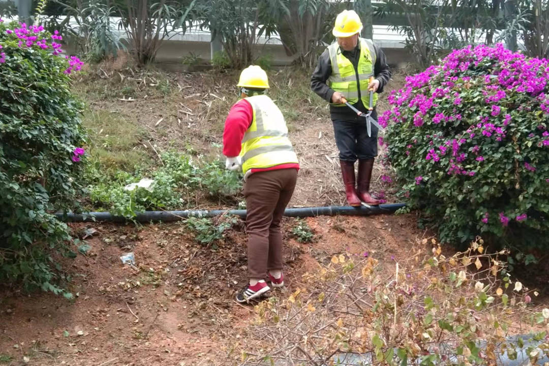 为做好春季浇水、补植等工作,广东怡轩园林绿化公司组织驻场养护工人对厂区内的公园绿地与道路两侧绿化带内的枯枝落叶、垃圾杂物进行彻底清理。同时,安排专人对道路两侧绿化带、公园广场内绿地植物枯萎、缺株断档等情况进行了全面摸排。